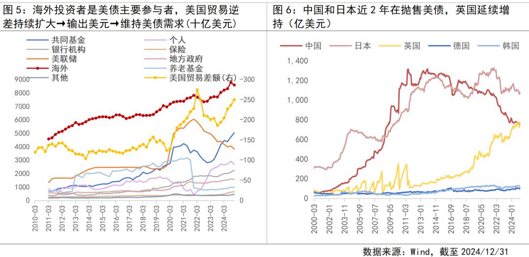 美国整体消费多而生产少,因而美国企业或消费者需大量进口商品并以此将美元输往贸易伙伴国,这也侧面加强美元储备地位;贸易伙伴国拿到美元后将大部分美元储备配置美债,进而形成"贸易顺差→积累美元→购买美债→支撑美国财政"的闭环。