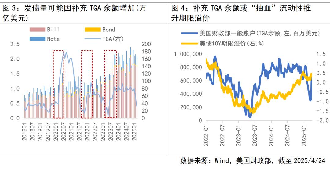 债务上限解决后的短债供给潮可能放大利率波动。债务上限解决后财政部再融资安排可能因需要补充此前使用非常规手段腾挪筹措资金消耗的TGA余额,导致发债量增加(短债或仍是主力)形成流动性“抽血”冲击。历史上在美国财政部TGA账户余额走高过程中,流动性冲击或推升期限溢价带动美债利率抬升。