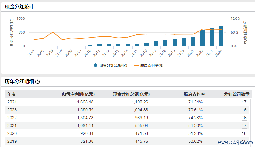 随着2024年年报披露完毕,白酒企业2024年派发“红包”金额也随之出炉,由于多家头部酒企增加了分红频次,最终让白酒企业2024年全年分红总金额定格在1190亿元,分红总金额同比增长近10%,而整个行业股息支付率也达到71.34%,仅次于2022年的74.28%,排在历史第二。