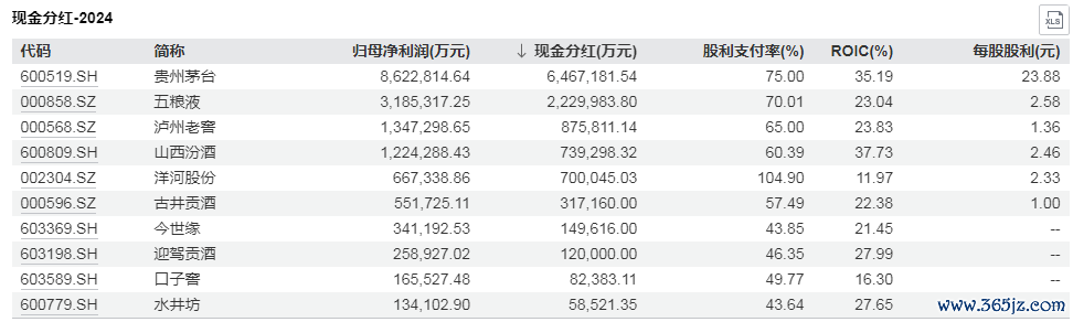 以泸州老窖为例,该公司2022年、2023年以及2024年的净利润同比增长幅度分别为30.29%、27.79%以及1.71%。然而,泸州老窖2024年年度拟派发现金红利67.59亿元(含税),叠加2024年中期分红,其去年全年现金分红总金额超过87亿元。